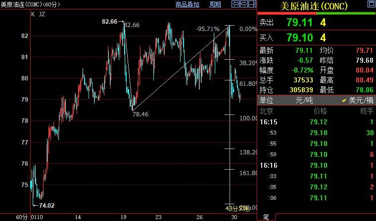 北京时间16:18,NYMEX原油期货下跌0.78%至79.06美元/桶;ICE