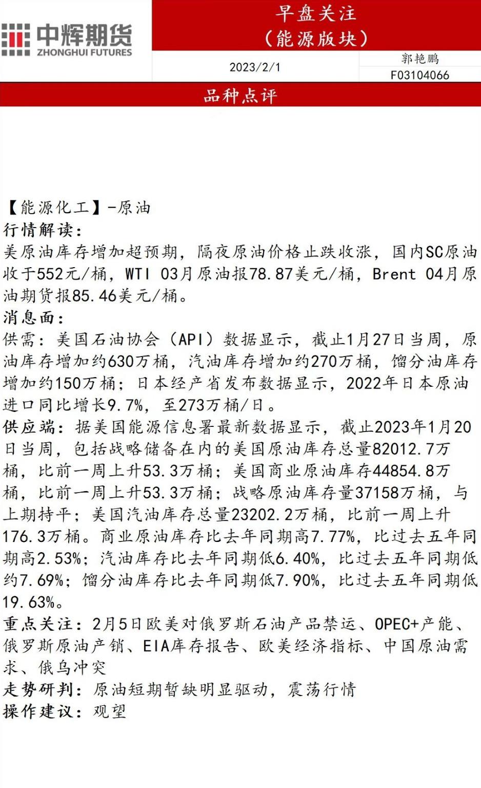 2月1日,中辉期货发布能源早盘关注,称原油短期暂缺明显驱动,震荡行情,建议观望。