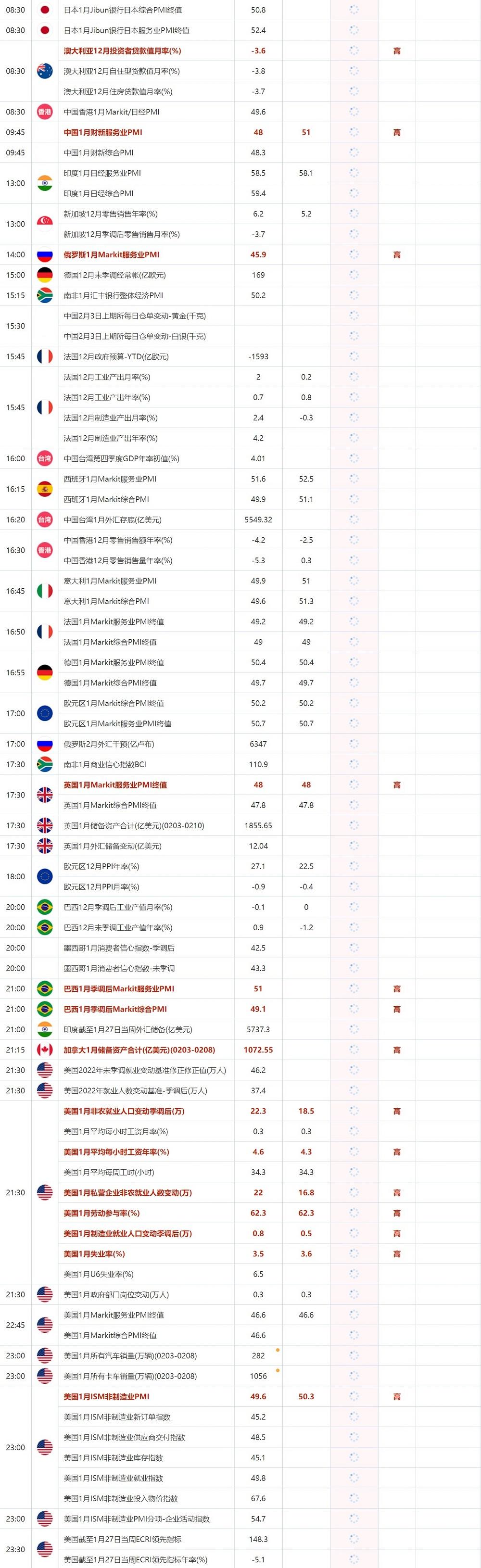 09:45 中国1月财新服务业PMI , 前值 48 , 预期值 51 , 公布值:待发布09:45 中国1月财新综合PMI , 前值 48.3 , 预期值 -- , 公布值:待发布