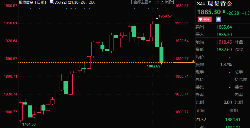 现货黄金本周累计下跌逾2%,创三周新低至1882.14美元美元/盎司。