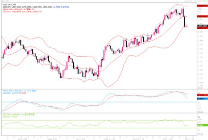 技术分析上,黄金价格上周五面临看空压力,并收盘跌破关键的21日移动均线1913美元/盎司。持续的抛售使金价失守关键的1900美元/盎司支撑位,同时黄金空头测试1860美元/盎司支撑区域。随着抛盘兴趣的回升,下一个下行目标位位于1850美元/盎司的心理关口,看涨的50日移动均线徘徊在该水平附近。更为坚硬的支撑在1800-1830美元区域。14日相对强弱指数(RSI)小幅走高,但仍低于中线,表明看空倾向仍然存在。上行方面,黄金价格将在1900美元/盎司面临阻碍。突破这一阻力对于收复21日移动均线至关重要。只要金价低于21日移动均线,那么黄金空头可能会继续掌控局势。