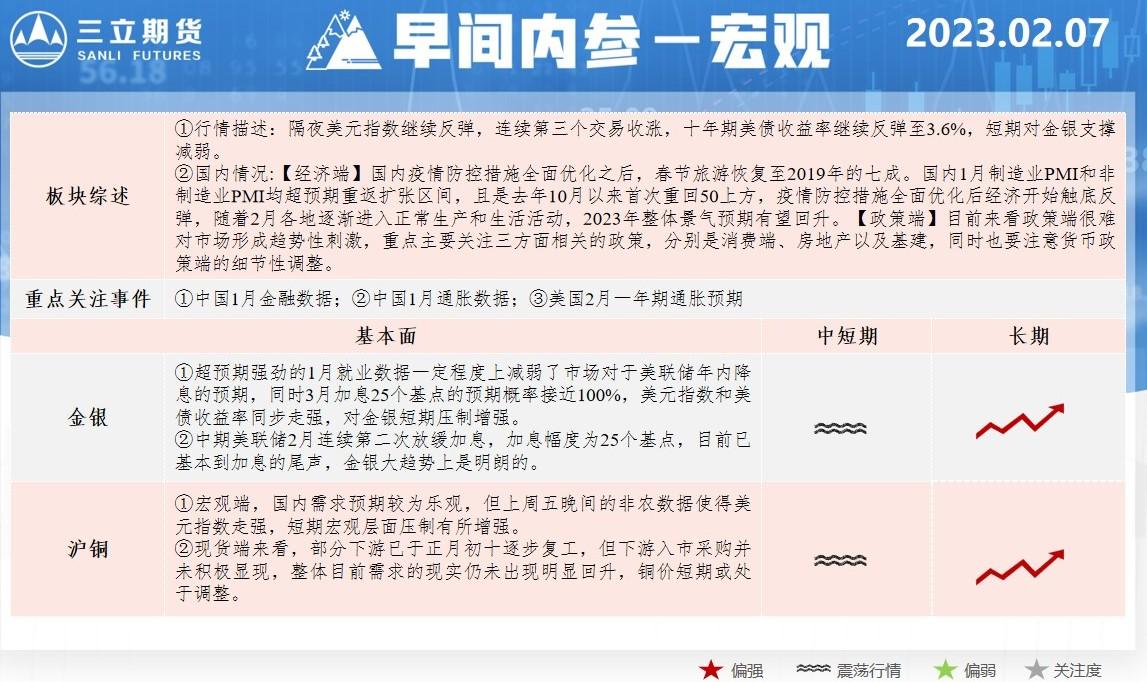 三立期货早间内参显示,金银中短期偏向震荡,长线偏多;沪铜中短线偏向震荡,长线偏多。