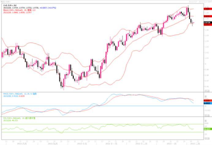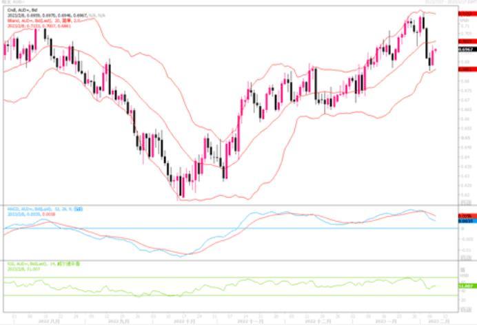 英镑兑美元的近期走弱,主要是英国央行在今后货币政策调动上出现了鸽派的口吻,英国央行上周四连续第10次加息,但放弃了在必要时继续“强力”加息的承诺,并表示通胀可能已经过高峰。英国央行的这种态度,引发投资者预计英国央行将很快结束并可能逆转其货币紧缩周期。投资者目前在等待英国央行的更多评论,以及周五出炉的英国第四季国内生产总值(GDP)初值,这可能提供该央行下一步行动的线索。日线图上,