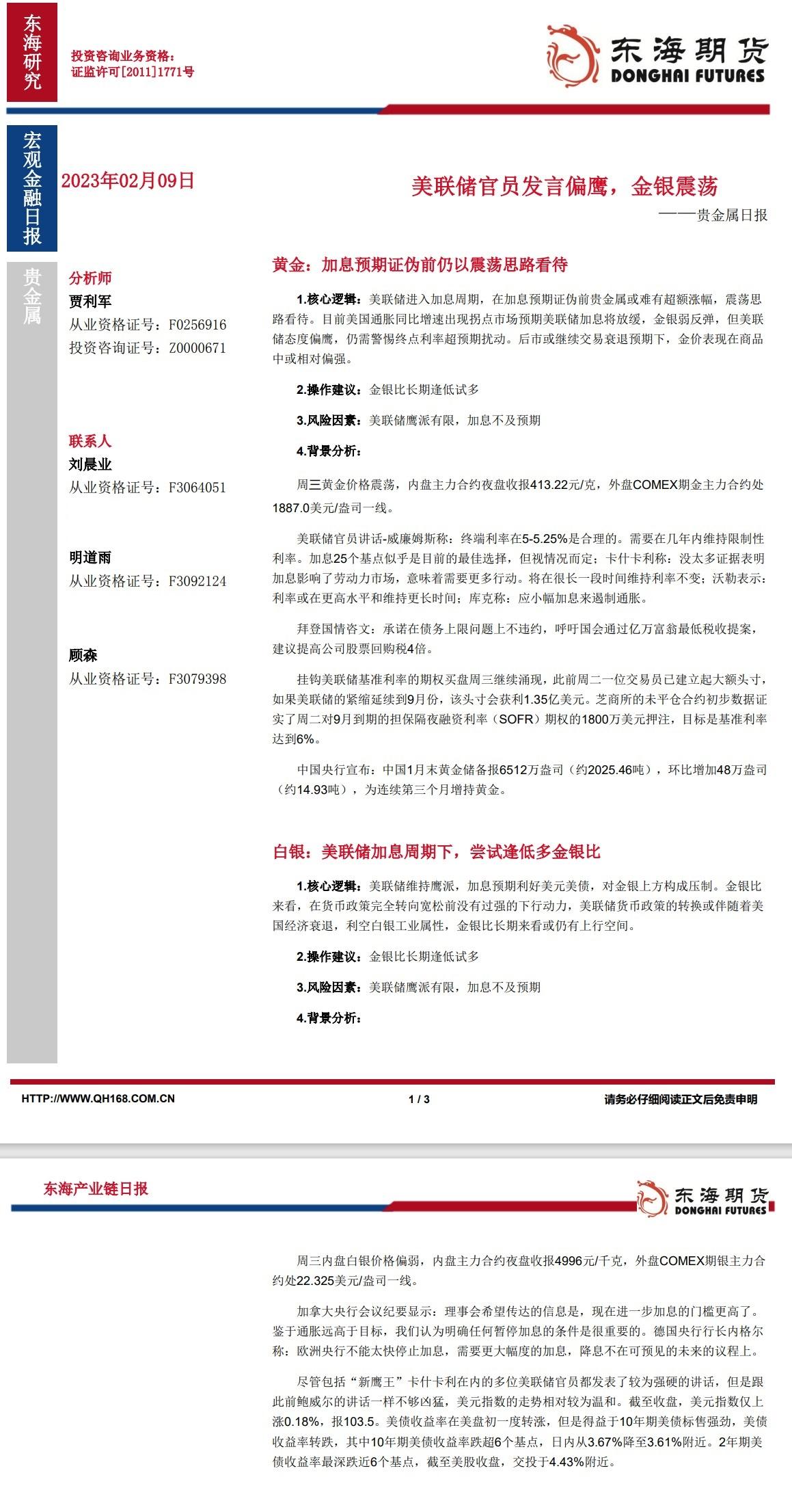 标题:【东海期货2月9日产业链日报】贵金属篇:美联储官员发言偏鹰,金银震荡