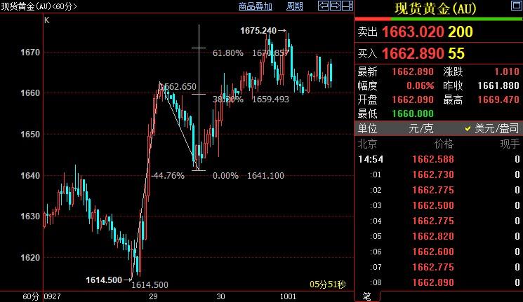 现货黄金上浮0.05%至1662.97美元/盎司;COMEX期金主力合约下沉0.04%至1671.4美元/盎司;