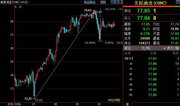 北京时间16:14,NYMEX原油期货下跌0.27%至77.85美元/桶;ICE