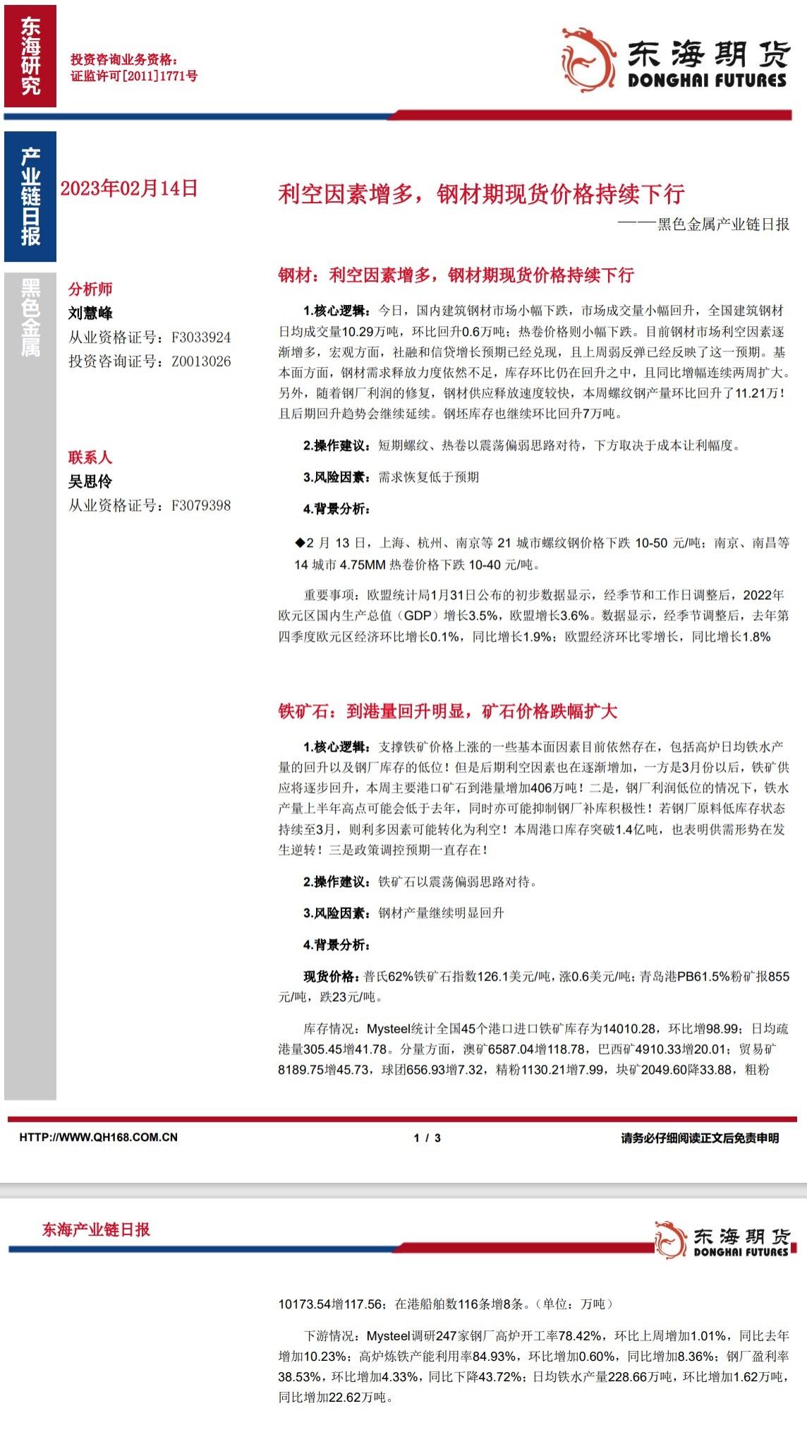 标题:【东海期货2月14日产业链日报】黑色篇:利空因素增多,钢材期现货价格持续下行