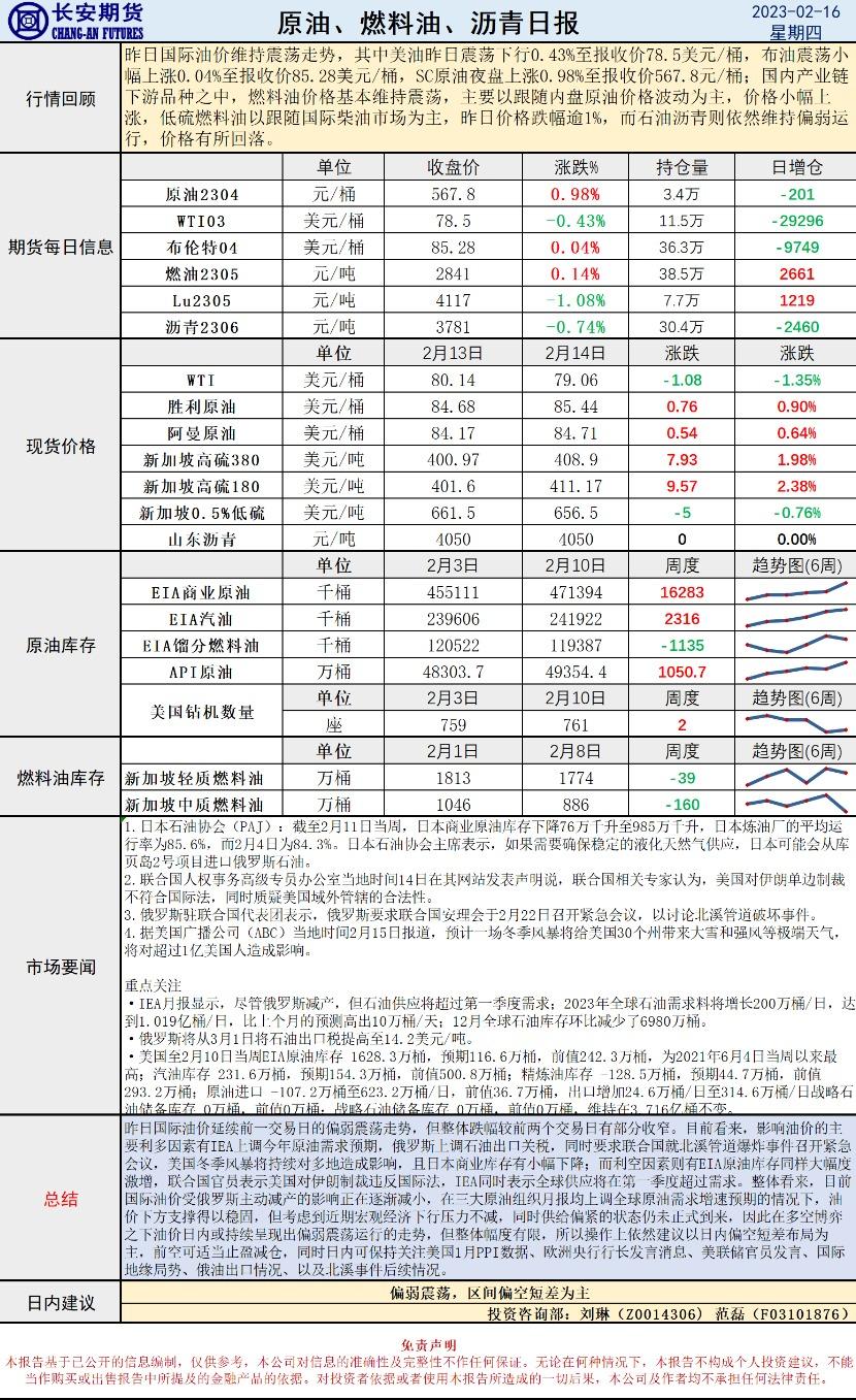 2月16日,长安期货发布原油早评,称IEA上调需求但难现涨势,EIA库存同步激增压制油价,预测价格偏弱震荡,建议区间偏空短差为主。