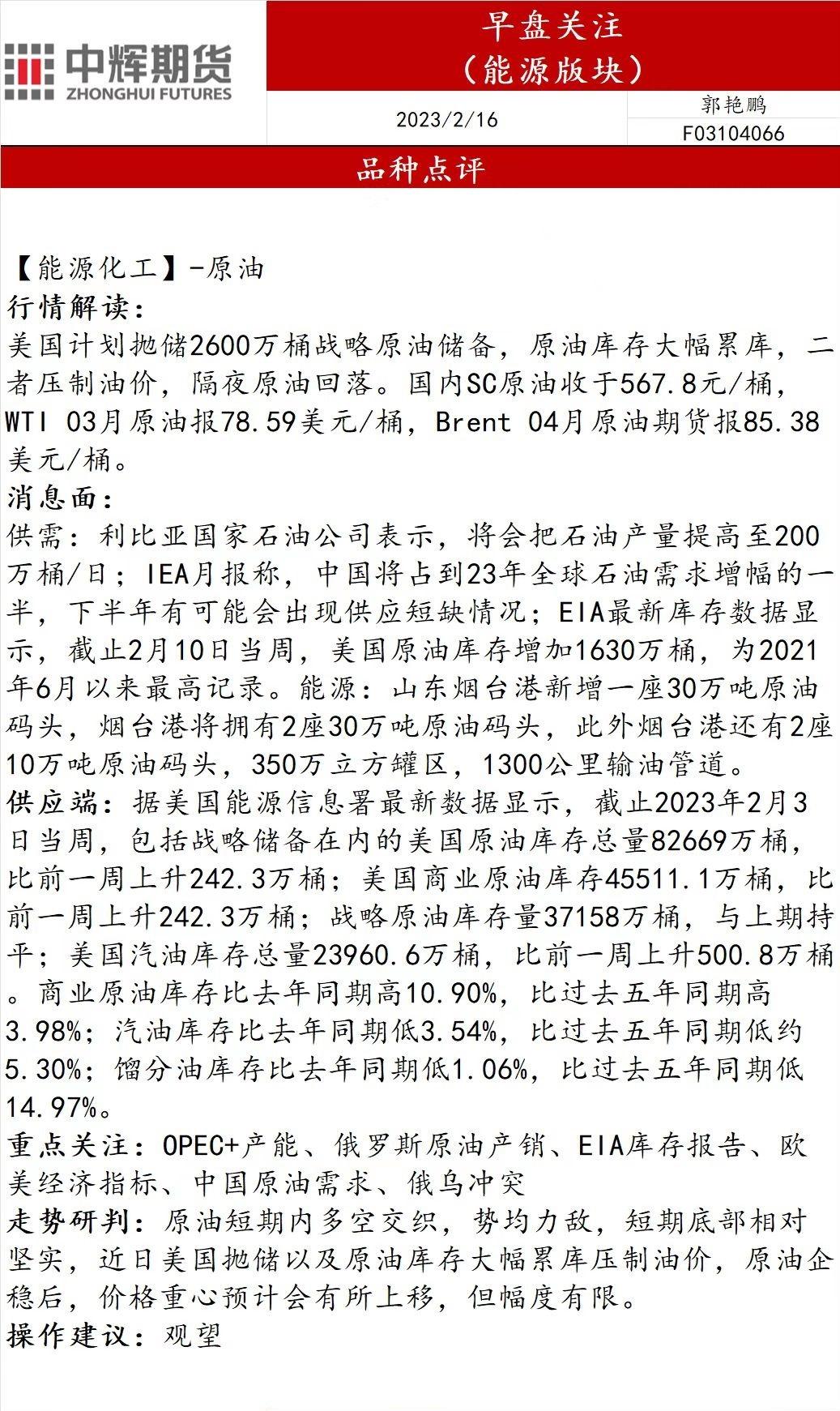 2月16日,中辉期货发布能源早盘关注,称原油价格重心预计会有所上移,但幅度有限,建议观望。