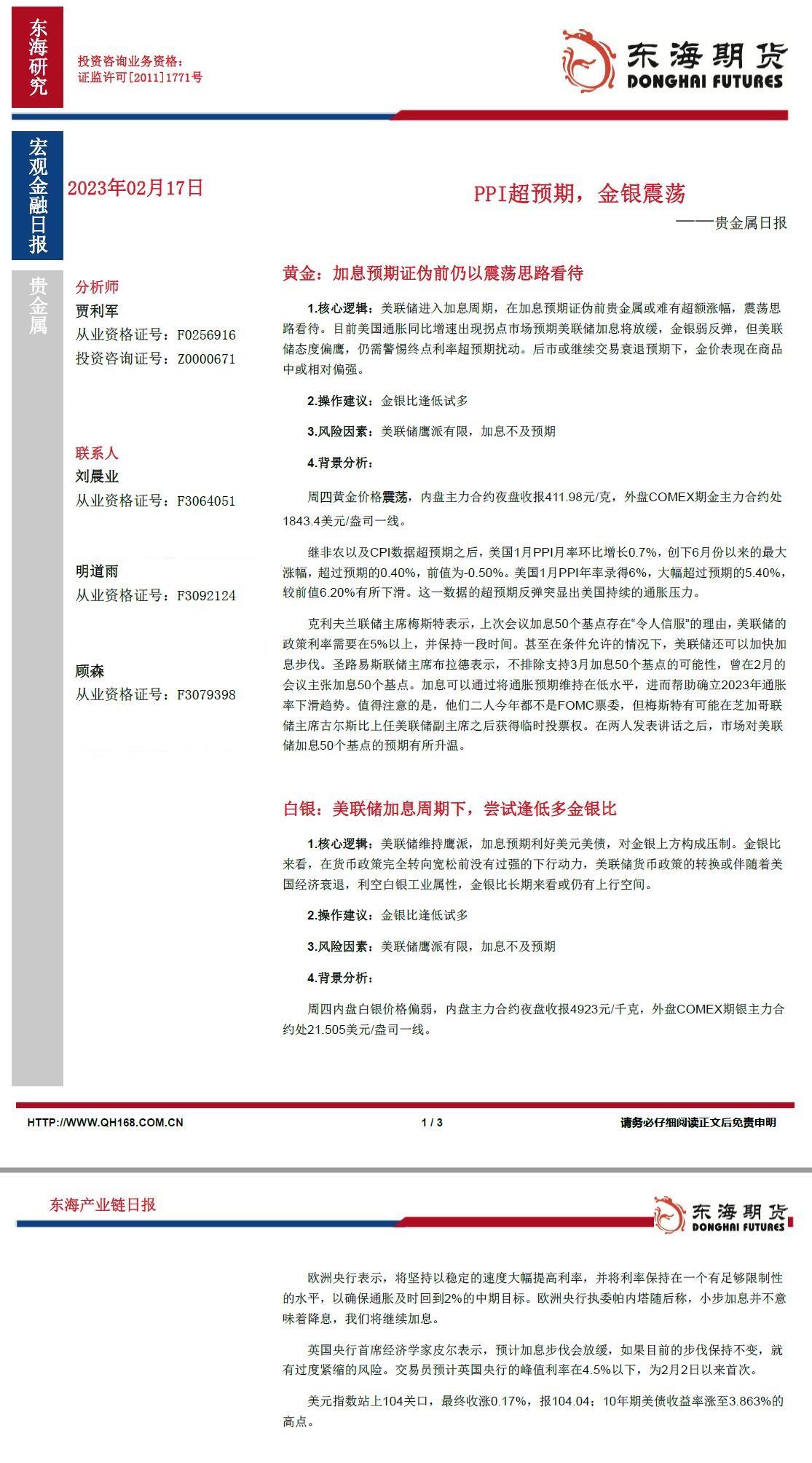 标题:【东海期货2月17日产业链日报】贵金属篇:PPI超预期,金银震荡
