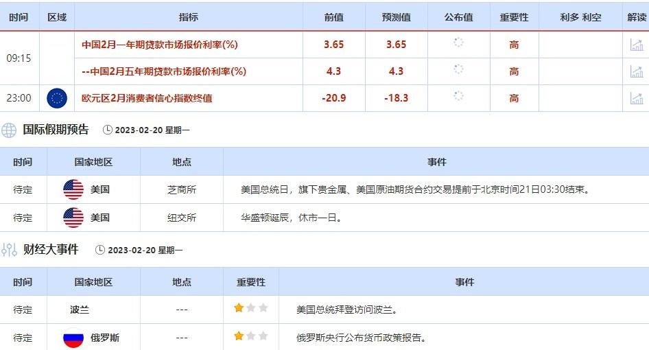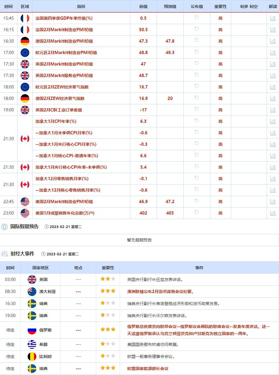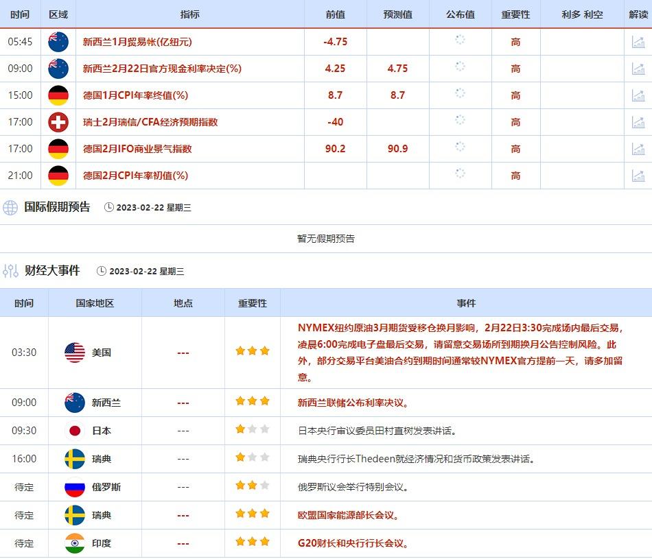 新西兰银行称,预计新西兰联储2月将加息50个基点,预计利率峰值为5%。2月22日,投资者还需关注G20财长和央行行长会议,官员讲话和会议结果料影响市场走势。