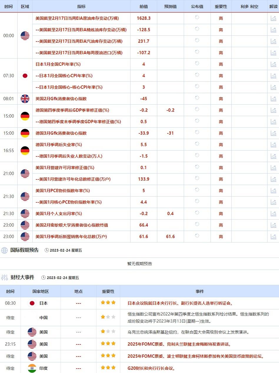 2月24日需关注日本众议院就日本央行行长、副行长提名人选举行听证会。此外,克利夫兰联储主席梅斯特发表讲话,波士顿联储主席柯林斯参加有关美国货币政策的论坛,也是当天需要关注的大事。