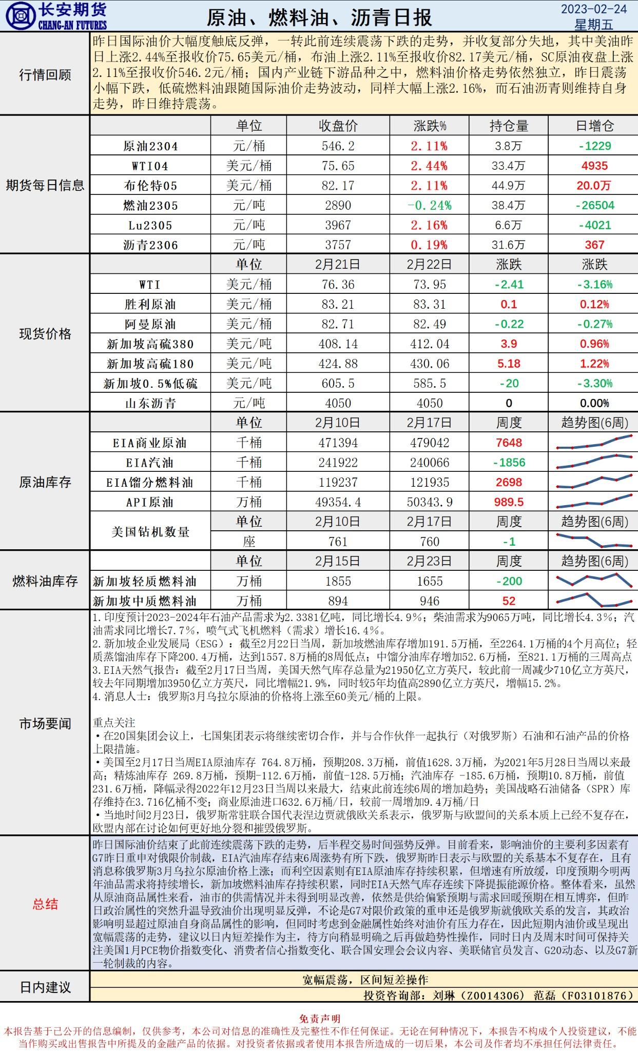 2月24日,长安期货发布原油早评,认为原油将宽幅震荡,建议区间短差操作。