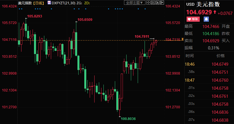 美元指数连续第四周上涨,涨幅近0.8%,并创1月6日以来新高至104.781。