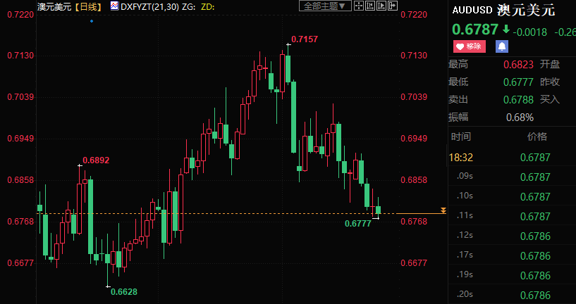 澳元兑美元本周跌幅扩大到近1.3%,并创1月6日以来低点至0.6777。