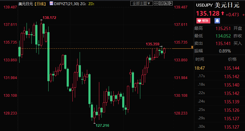 美元兑日元二连涨,升幅逾0.7%,创12月20日以来新高至135.359。