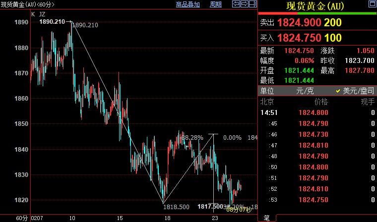 现货黄金上涨0.14%至1824.77美元/盎司;COMEX期金主力合约下跌0.52%至1832.0美元/盎司;