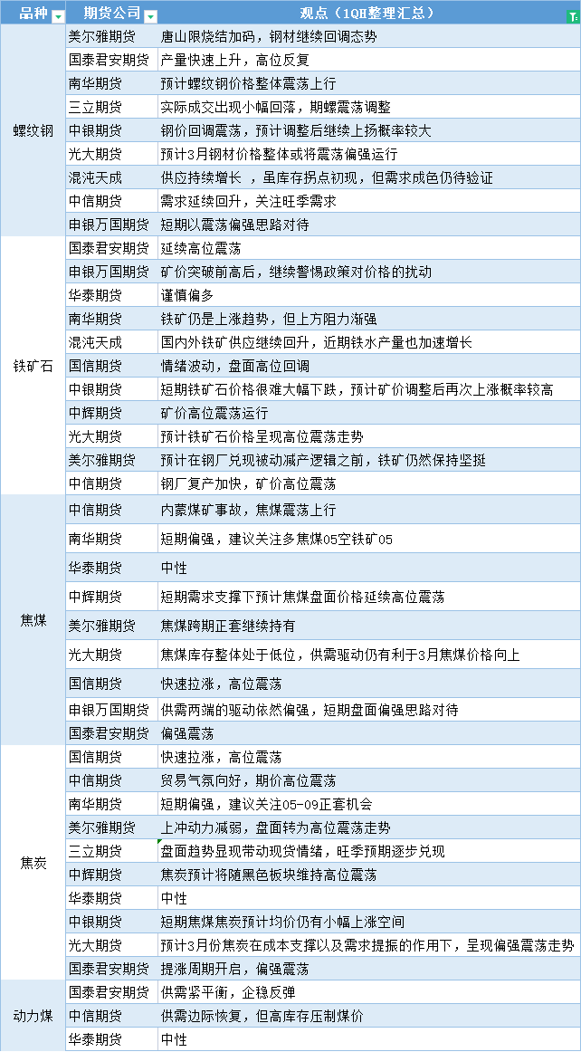标题:期货公司观点汇总一张图:2月27日黑色系(螺纹钢、焦煤、焦炭、铁矿石、动力煤等)