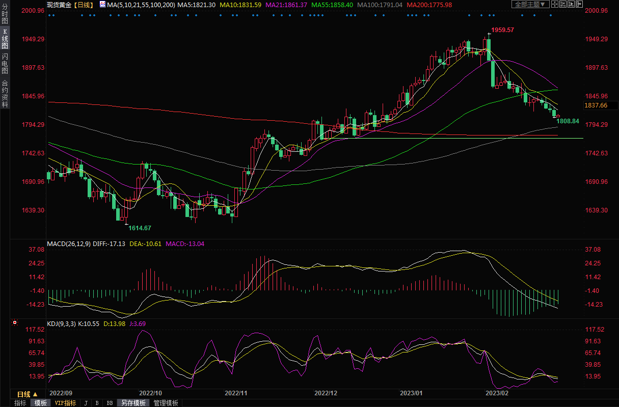 现货黄金窄幅震荡,目前交投于1813美元/盎司附近。上周五金价持续走弱,一度创近八周新低至1808.84美元/盎司,因为美国1月份PCE强于市场预期,提升了市场对美联储更高终端利率的预期,