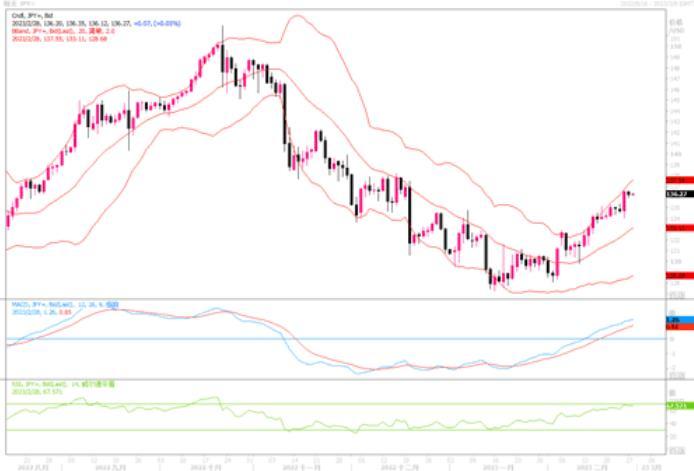 欧元兑美元上涨0.58%,至1.0607美。1月美国耐久财订单下降4.5%,降幅大于预期,耐久财订单在12月增长5.1%。这份报告削弱了美国利率的一些鹰派倾向,因此引起了美元的获利回吐行情。市场在等待将于3月10日公布的美国2月失业率和3月14日的消费者物价指数(CPI)数据,这将影响美联储的利率政策和联储推动通胀回归目标的努力。预料在市场看到下一份非农就业报告以及CPI之前,是不会太愿意将美元大幅推低。周一当天欧元区公布2月经济景气指数位99.7低于预期的101;2月消费者信心指数终值为-19符合预期。数据对欧元的影响作用不大,当前走势依然是看美元的脸色。日线图上
