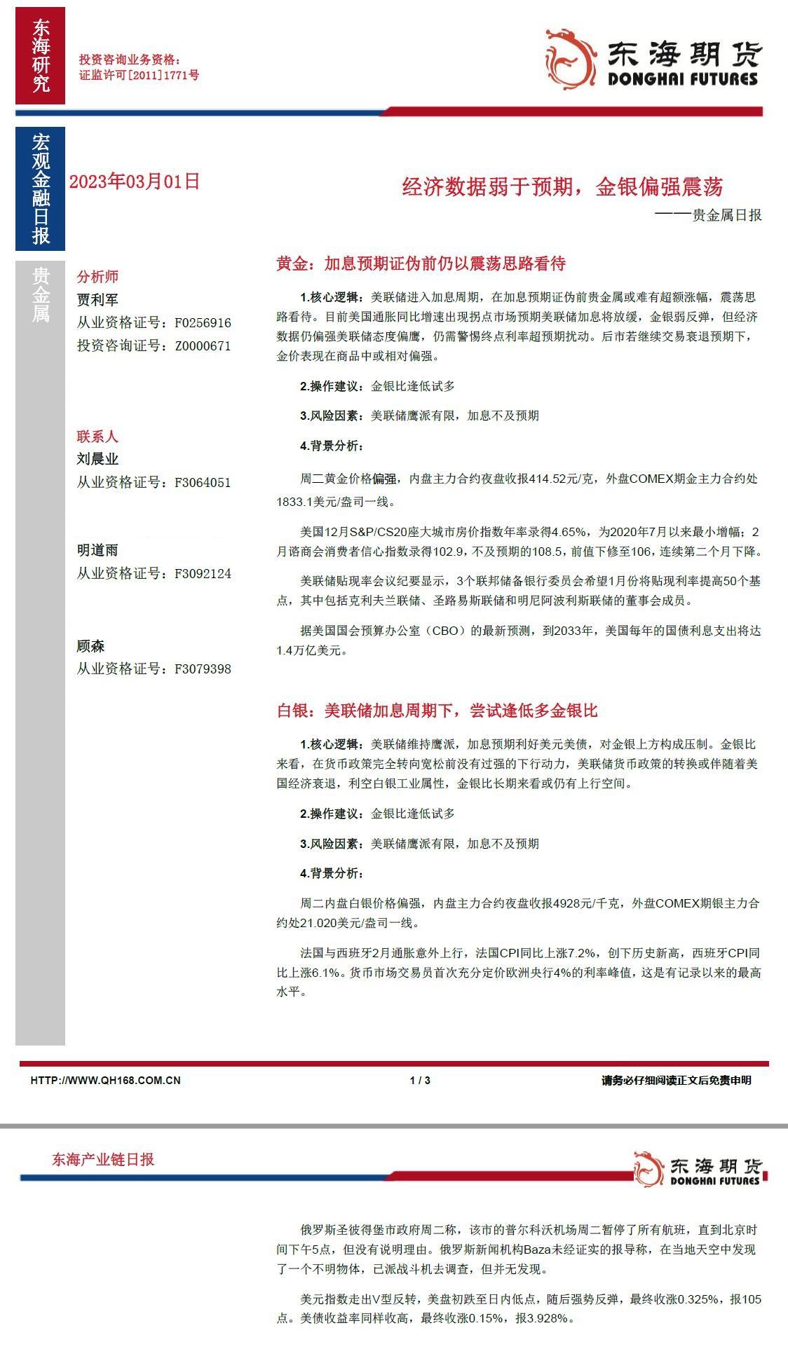标题:【东海期货3月1日产业链日报】贵金属篇:经济数据弱于预期,金银偏强震荡