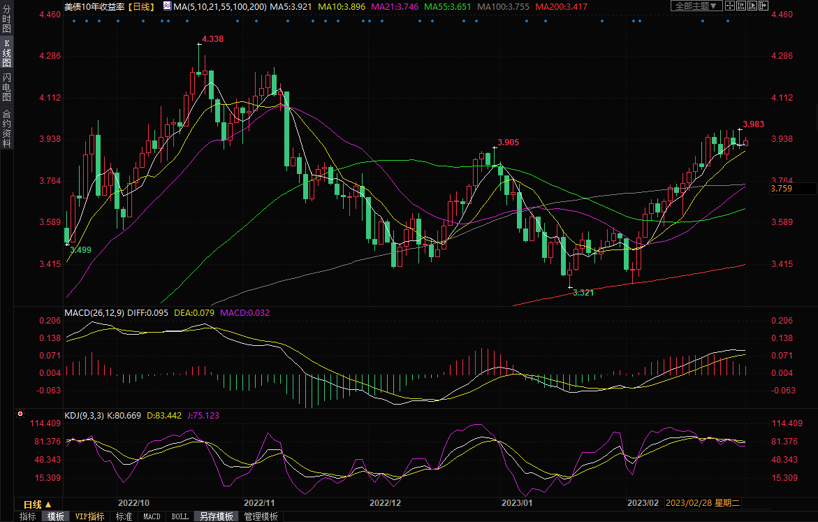 10年期国债收益率周二盘中触及3.983%的11周新高,但收盘下降1.6个基点,至3.906%;对利率敏感的两年期国债收益率盘中升至接近近四个月高点的水平,后回落至基本持平。周三亚市,美国10年前国债收益率小幅上涨至3.938%附近。