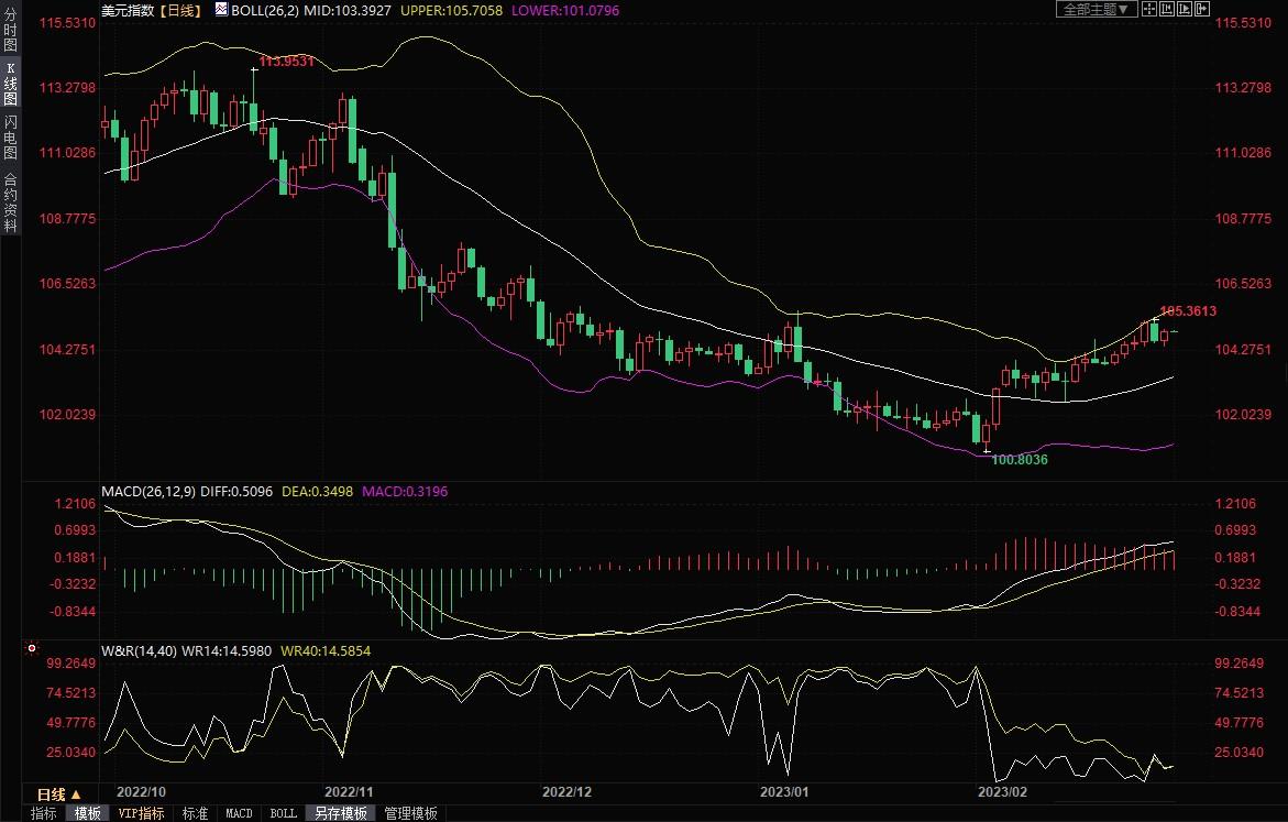 美元指数窄幅震荡,目前交投于104.94附近。美元兑主要货币周二在震荡交投中攀升,录得9月以来的首次月线上涨,通胀仍居高不下之际,人们预计利率将在一段时间内保持高位,且对经济衰退的担忧使投资者感到紧张。受到中长线逢低买盘支撑,金价周二上涨0.54%。油价周二上涨近2%,收复了上一交易日的失地,并一度创下逾一周新高,因为对中国经济强劲反弹的希望抵消了对美国加息拖累世界最大经济体原油消费的担忧。