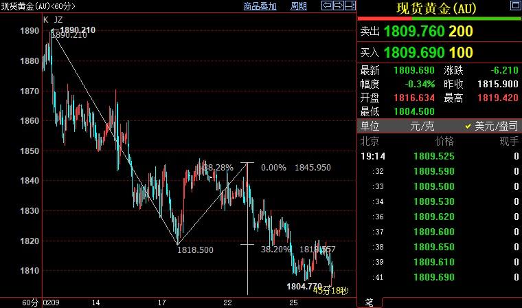 现货黄金下跌0.40%至1809.66美元/盎司;COMEX期金主力合约下跌0.45%至1816.6美元/盎司;