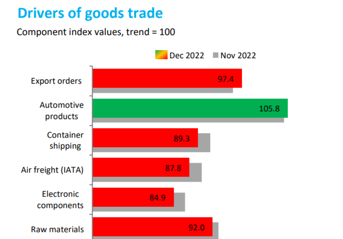 例如,集装箱航运指数为89.3、电子元器件为84.9、原材料指数为92.0,均都低于趋势,并在下降。
