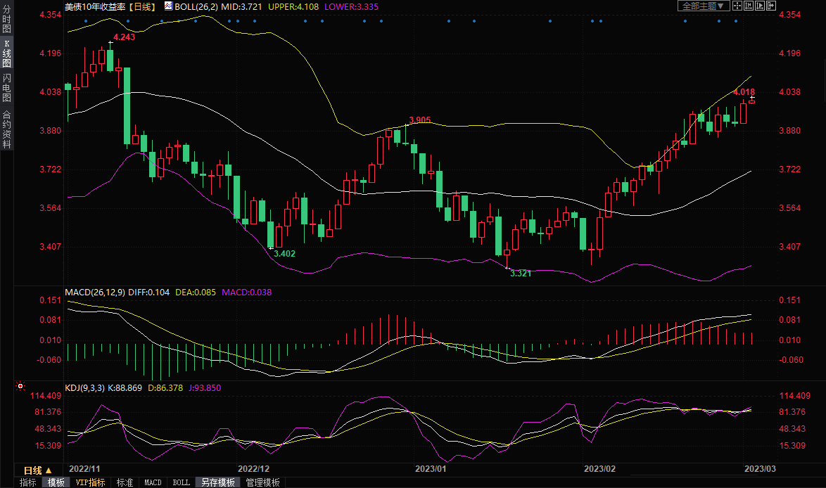 美债收益率在供应管理协会(ISM)的制造业数据公布后跳升。10年期国债收益率自11月以来首次触及4%。更能反映货币政策预期的两年期美债收益率一度触及4.9%的2007年以来最高。五年期美债收益率触及11月以来最高,盘尾上涨超过9个基点,报4.261%。