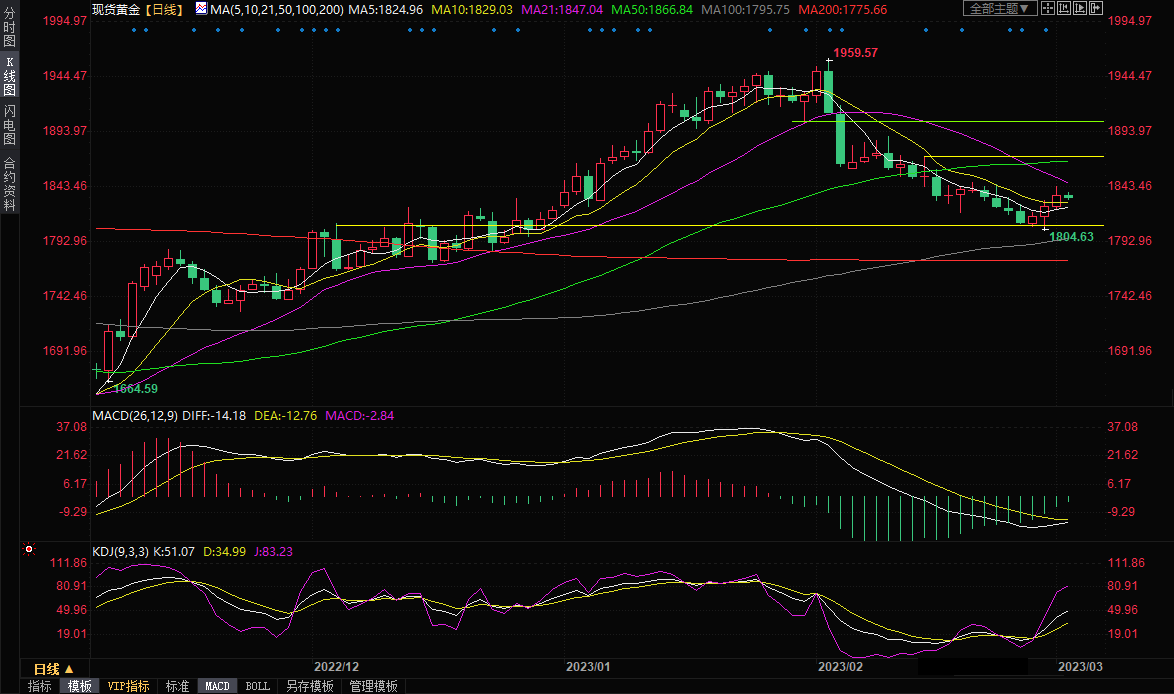 对美联储更高终端利率预期和更长时间维持高利率水平的预期继续给美债收益率提供上涨动能,美国10年期国债周三大涨逾2%,周四延续涨势,一度创近三个半月新高至4.018%,这增加了持有黄金的机会成本,投资者仍需要提防金价的短线下行风险。需要提醒的是,全球最大的黄金ETF——SPDR持仓周三减少2.61吨,至912.69吨,为1月20日以来新低。本交易日将迎来美国初请失业金人数变动,市场预期仍低于20万人,这意味着美国劳动力市场依然强劲,也可能会限制金价反弹走势。留意5日均线1825附近支撑,若能守住该位置,则金价后市仍有机会延续反弹走势;否则,则需要提防金价重回跌势的可能性。