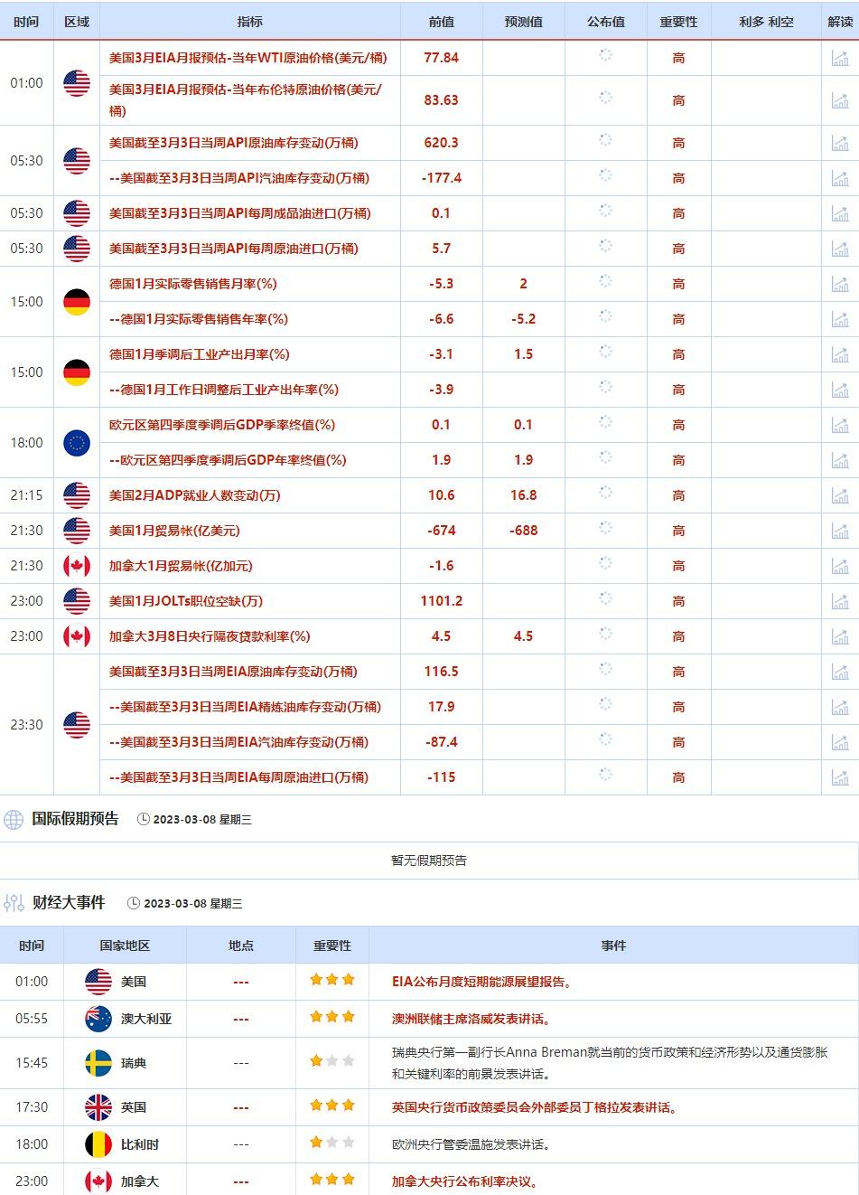 ③3月8日(周三)关键字:美国截至3月3日当周API和EIA原油库存变动 ,美国2月ADP就业人数变动,澳洲联储主席洛威