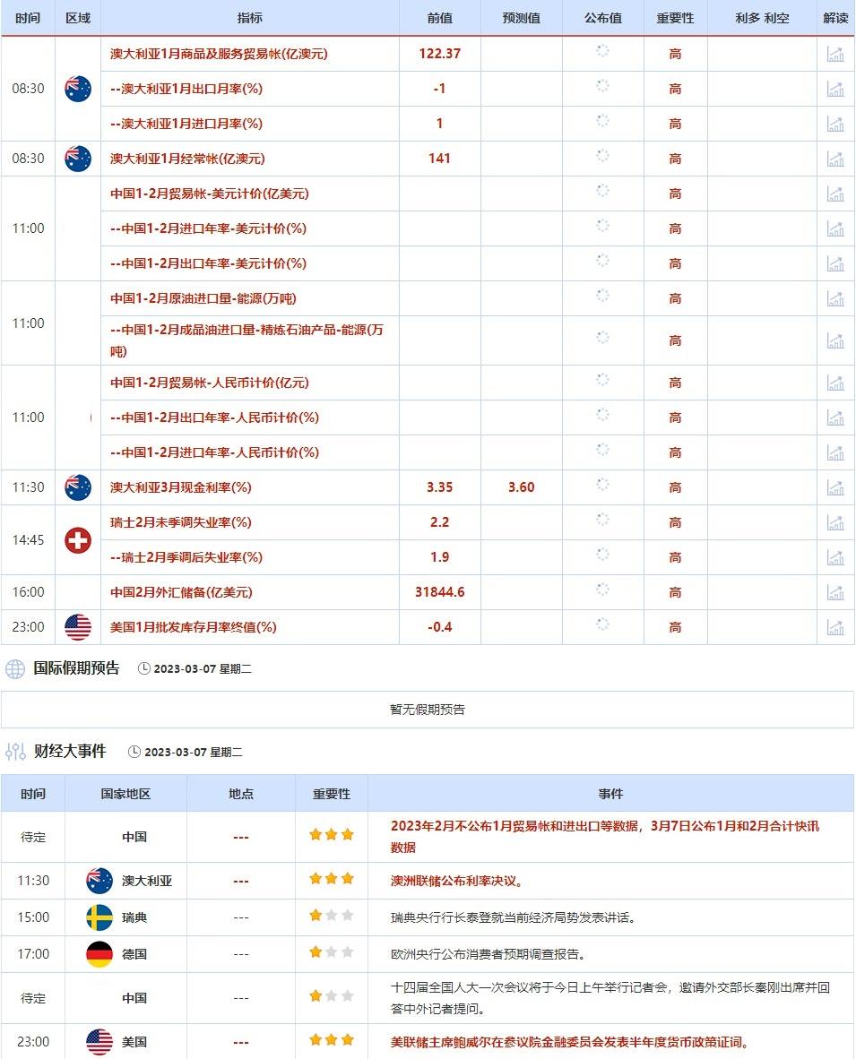 ②3月7日(周二)关键字:澳洲联储利率决议,美联储主席鲍威尔