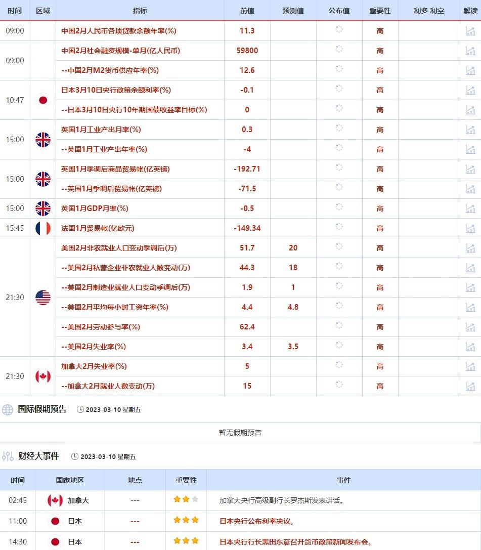 日本政府提名由经济学家植田和男担任下任日本央行行长,提名原金融厅官员冰见野良和日本银行理事内田真一担任副行长。3月9日,日本众议院就日本央行领导层任命进行投票,也是当天需要关注的焦点。⑤3月10日(周五)关键字:日本央行利率决议,美国2月非农