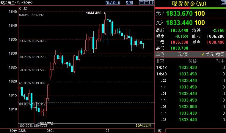 现货黄金下行0.07%至1835.10美元/盎司;COMEX期金主力合约下跌0.22%至1841.3美元/盎司;