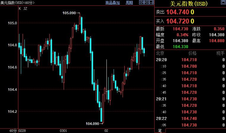美元指数上涨0.33%至104.736。