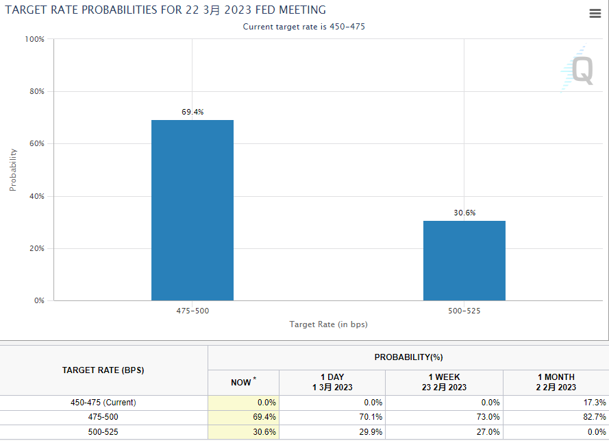 美国联邦基金利率目前位于4.5%至4.75%区间。投资者仍大多预计美联储将在本月晚些时候的下次政策会议上加息25个基点,但加息50个基点的预期有所增加。根据CME的“联储观察”工具,后者可能性从一周前的27%升至30.6%。