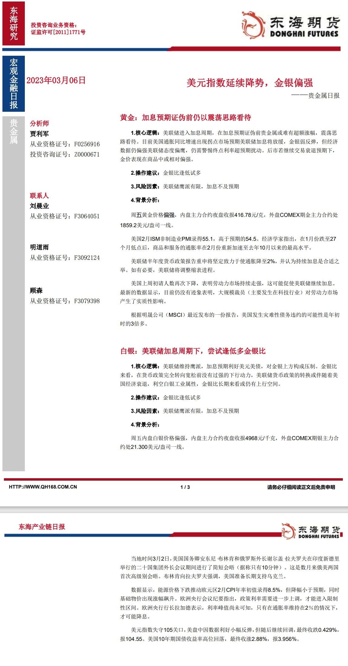 标题:【东海期货3月6日产业链日报】贵金属篇:美元指数延续降势,金银偏强
