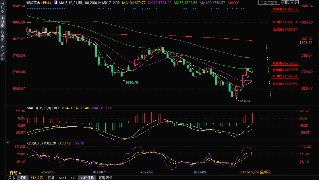 整体来看,市场对全球多数央行、尤其是美联储进一步大幅加息的预期笼罩市场,令金价短线小幅承压,非农前金价仍有震荡走弱的可能性,但市场价格已经部分消化了该因素,除非非农数据意外大幅强于预期,金价短线可能跌至1700关口下方;否则,如果非农数据即使略微强于预期,金价在短线下跌后都存在重拾涨势的可能性,而且金价短线跌破9月21日高点1687.95前,后市多头仍有继续反弹走势的机会,基本面对经济衰退和地缘局势的担忧也在中长线支撑金价。北京时间10:26,