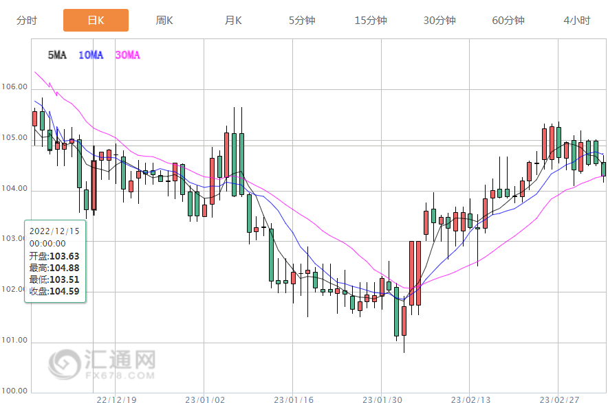 美元指数纽约尾盘下跌0.26%,报104.35。2月3日发布的1月就业报告显示,美国就业岗位意外猛增51.7万个,失业率降至逾53年半最低的3.4%,这表明劳动力市场顽固地处于吃紧状态。