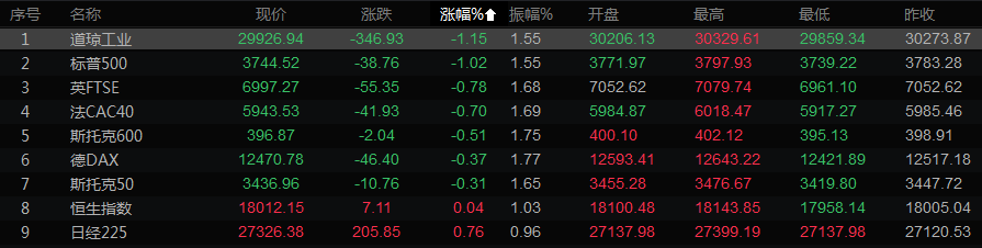 标普500指数11个主要板块中,10个收低,房地产股领跌,跌幅高达3.3%。费城半导体指数、小盘股指数和道琼斯运输指数等股指也下跌。成长股指数下跌0.76%,价值股指数跌幅为1.18%。