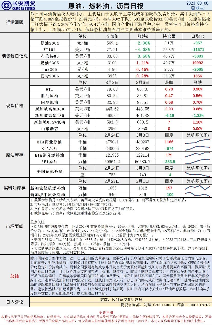 3月8日,长安期货发布原油早评,认为原油将宽幅震荡,区间短差前空离场。