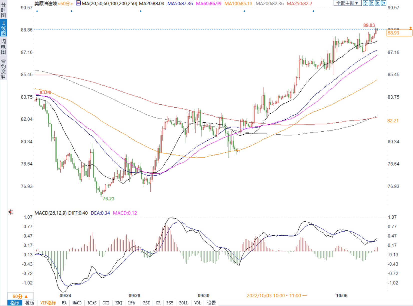 周四(10月6日)布油期货上涨1.1%,结算价报收94.42美元/桶。由于OPEC+产油国同意大幅减产,再加上欧盟对俄罗斯石油实施禁运,未来的供应会很紧张,油价进一步上行。
