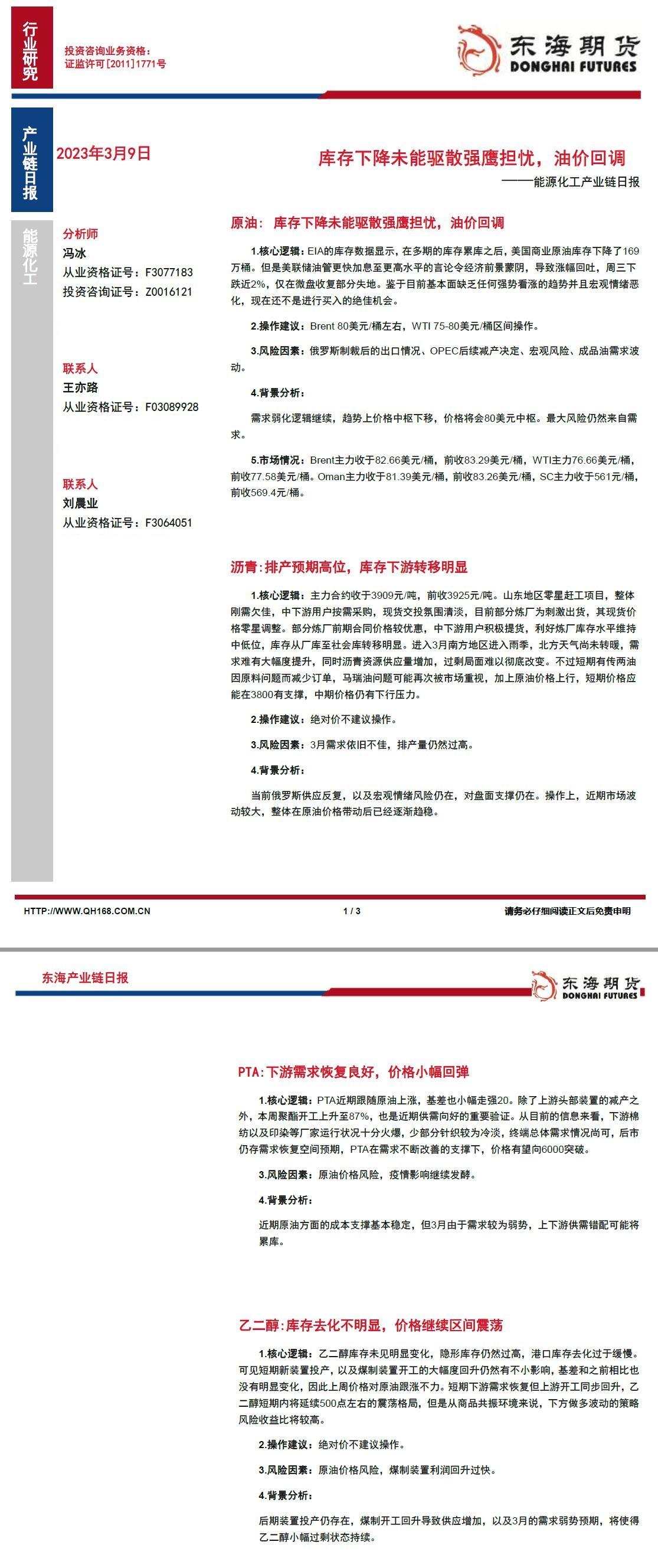 标题:【东海期货3月9日产业链日报】能化篇:库存下降未能驱散强鹰担忧,油价回调