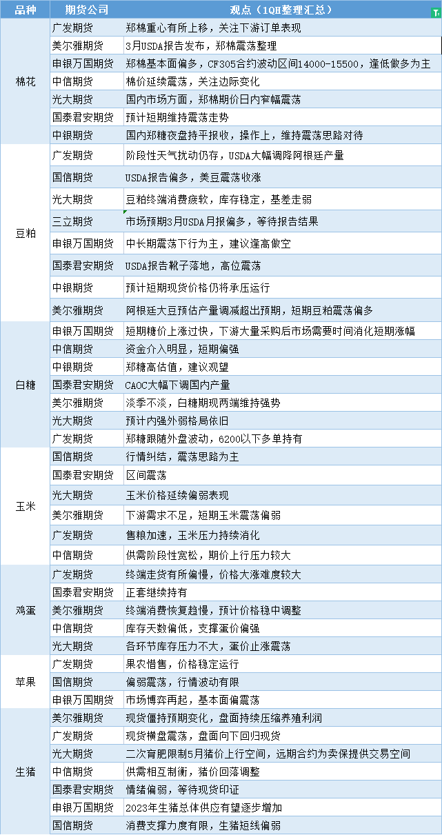 标题:期货公司观点汇总一张图:3月9日农产品(棉花、豆粕、白糖、玉米、鸡蛋、生猪等)