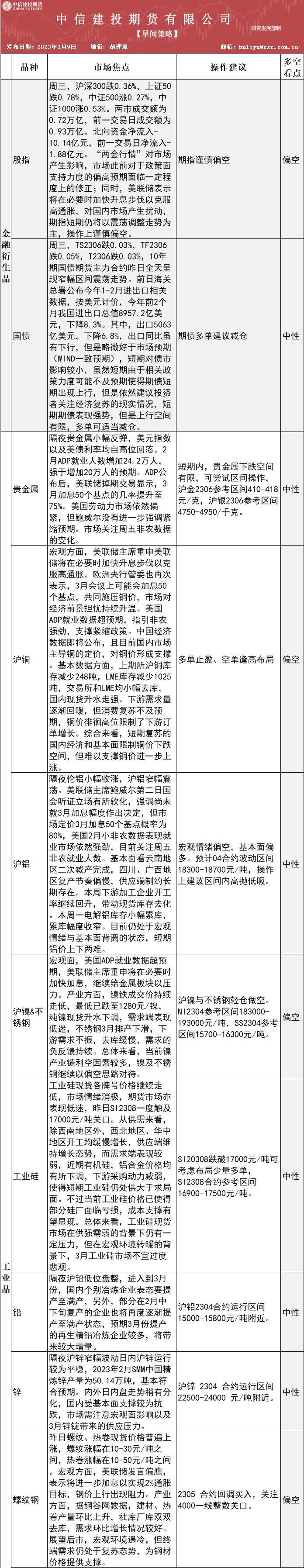 标题:中信建投期货3月9日早间交易策略
