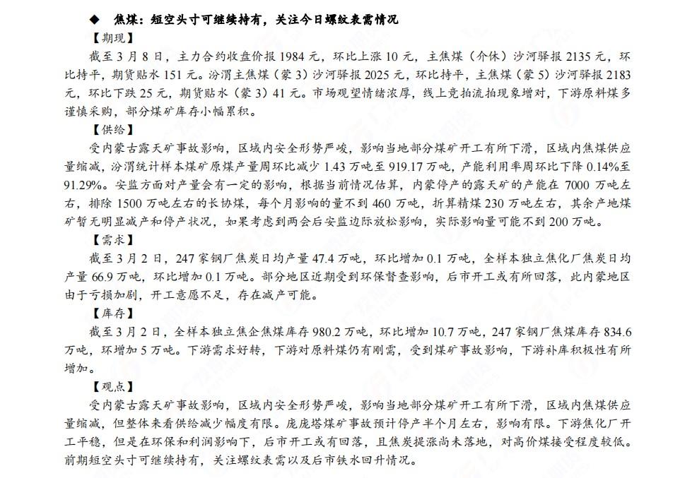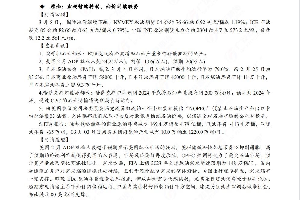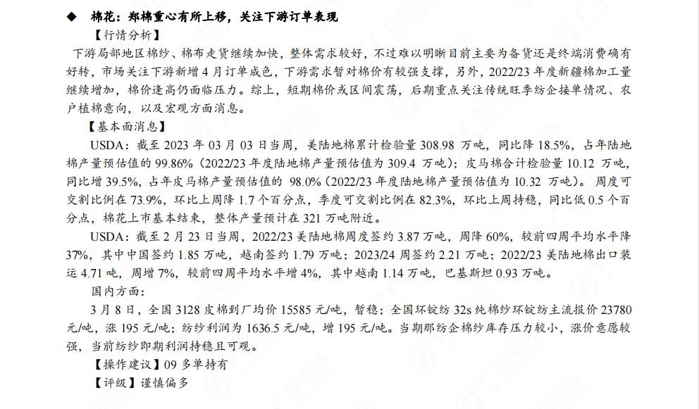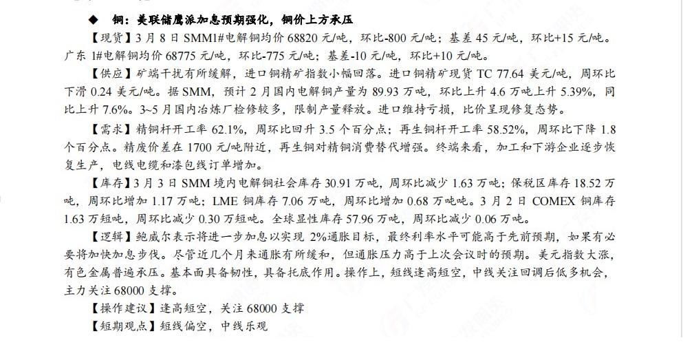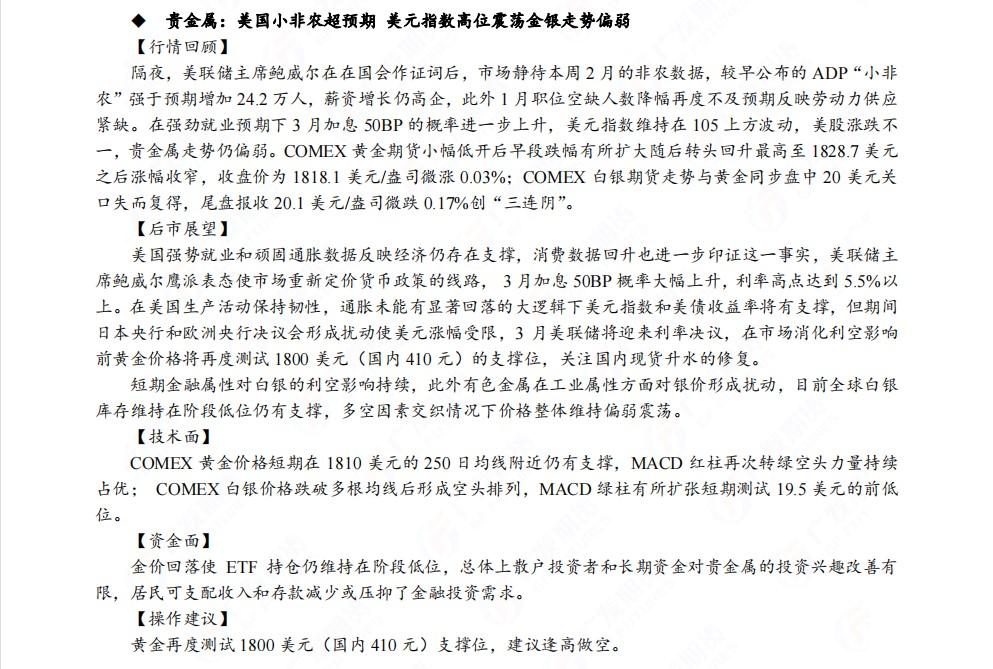 广发期货发布3月9日早知道,股指期货短期建议逢低做多,黄金再度测试1800美元支撑位,建议逢高做空;铜短线偏空,中线乐观;钢材价格预计维持高位震荡走势;焦煤前期短空头寸可继续持有;白糖和棉花谨慎偏多,关注油价回调后做多机会,布油关注80美元支撑。