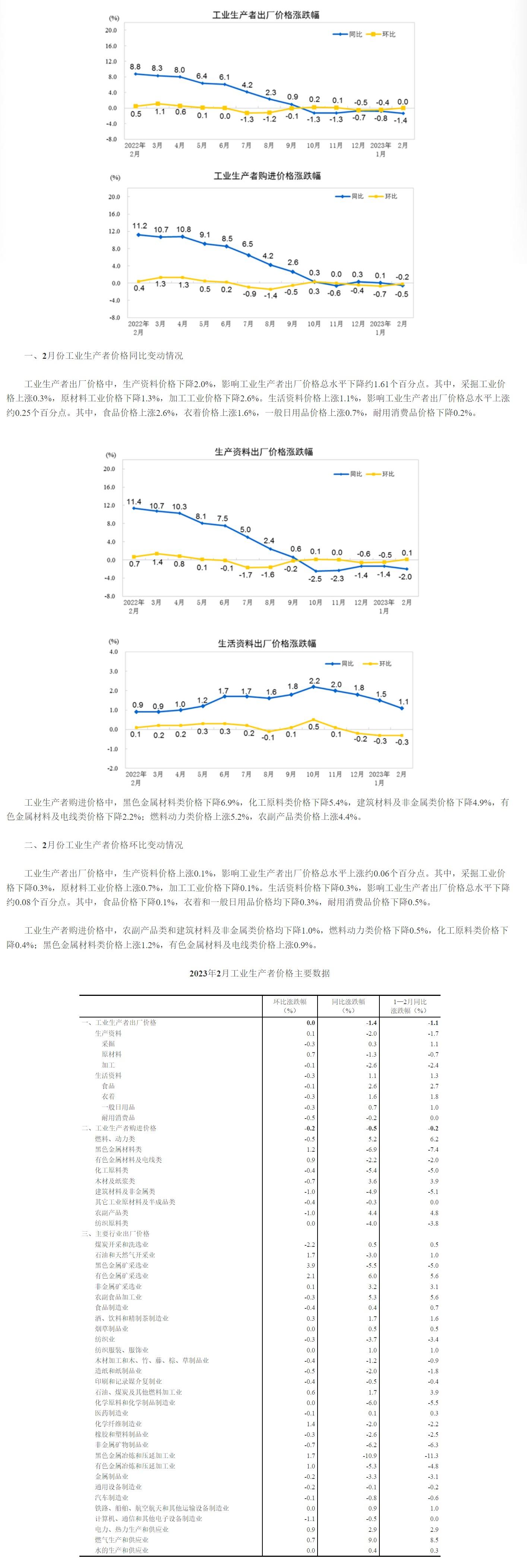 2023年2月份,全国工业生产者出厂价格同比下降1.4%,环比持平;工业生产者购进价格同比下降0.5%,环比下降0.2%。1—2月平均,工业生产者出厂价格比去年同期下降1.1%,工业生产者购进价格下降0.2%。