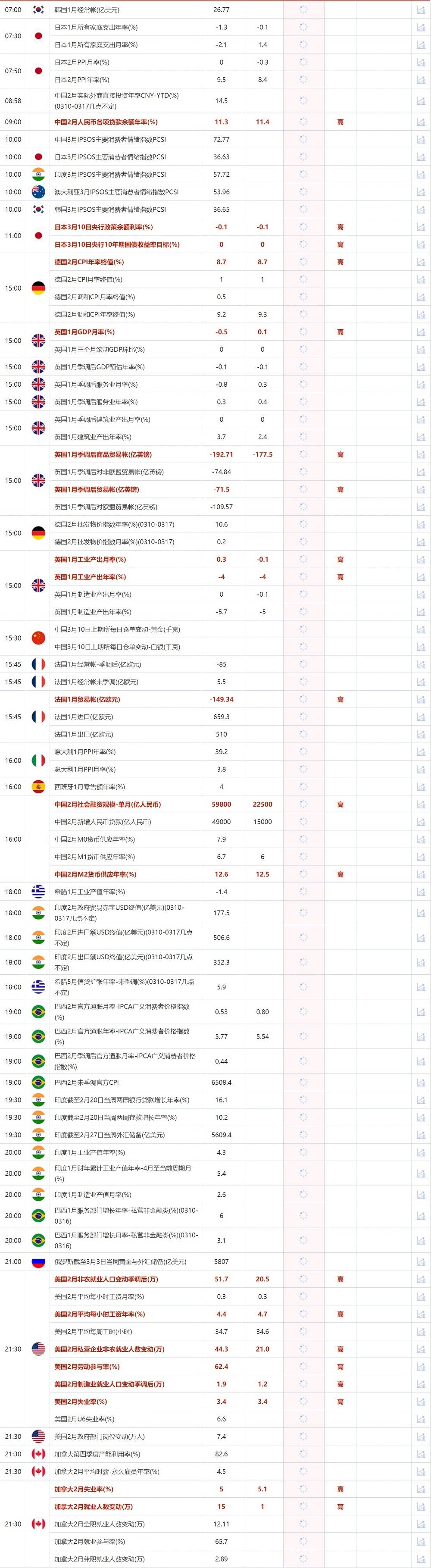 11:00 日本3月10日央行10年期国债收益率目标(%) , 前值 0 , 预期值 0 , 公布值:待发布15:00 德国2月CPI年率终值(%) , 前值 8.7 , 预期值 8.7 , 公布值:待发布15:00 德国2月CPI月率终值(%) , 前值 1 , 预期值 1 , 公布值:待发布