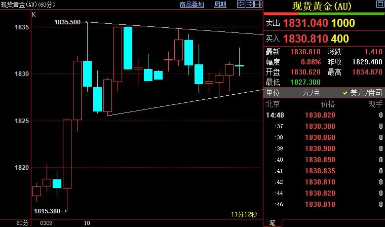 现货黄金下跌0.03%至1830.24美元/盎司;COMEX期金主力合约下跌0.03%至1834.1美元/盎司;